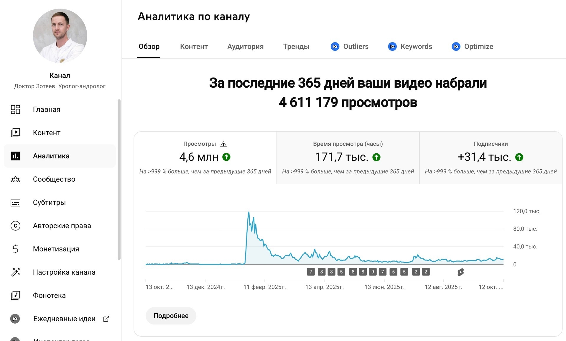 расширили темы 2.Провел анализ ниши 3. Подобрали темы с потенциалом высоких просмотров 4. Написали цепляющие сценарии для длинных и коротких видео (внедрены СТА на подписку, лайки, комменты, переход в тг 5. Разработали новые обложки 6. Сменила оформление канала; 7. Ежемесячно проводили по две съемочных смены (6 часов) 8. Раскачали харизу спикера - стало легче говорить на камеру 9. Внедрили режиссерский монтаж во всех роликах графика, плашки вставки - все для захвата и удержания. внимания зрителя 10. Seo оптимизацию всех роликов 11. Сменили картинку на более киношную